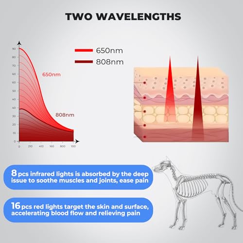 Professional-Grade Cold Laser Therapy Device: 24 light beads with 650nm+808nm is a vet-trusted combo to address both surface and deep-tissue pet issues. 650nm red light targets for wounds recovery, skin problems, surface inflammation, etc. 808nm near-infrared penetrates deeper to relieve pain, ease arthritis stiffness, accelerate muscle recovery from strains/sprains, and reduce inflammation in soft tissues. Safe for daily use on dogs, cats, and horses—ideal for at-home care or post-vet treatment
