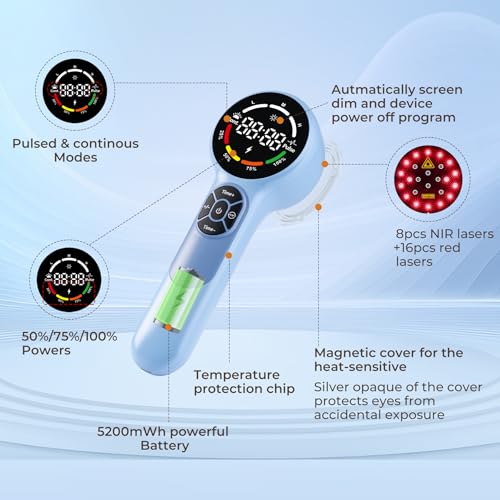 Upgraded Advanced IR Red Light Therapy Device for Pets: This NIR red light therapy device features a high-definition display screen and intuitive multifunctional buttons. 3 adjustable power levels: High/Medium/Low. 2 modes: Continuous/Pulsed. Timer: 5-60 minute adjustable. The IR cold laser therapy device fits any treatment need. Plus, the 5200mWh high-capacity battery provides 5-7 hours of continuous use per charge—enough for 6-9 days of daily care (1-2 sessions/day) for dogs, cats, or horses