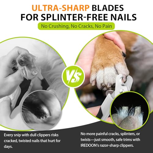 【CRACK-PROOF CUTTING】IREDOON’s sharpened blades slice through nails like warm butter – no painful cracks or splinters! Single stroke delivers mirror-finish nails without squeezing stress. No squeezing, no stress, just perfect paws.