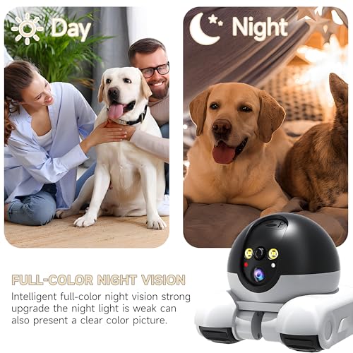 【MOVABLE DUAL-LENS PET CAMERA】Control this wheel-equipped pet cam remotely via app! Dual 1080p lenses monitor pets front/back simultaneously while tracking movements in 360°. Bonus: Activate the laser to play with anxious pets from anywhere. Never miss a moment with mobile patrols!