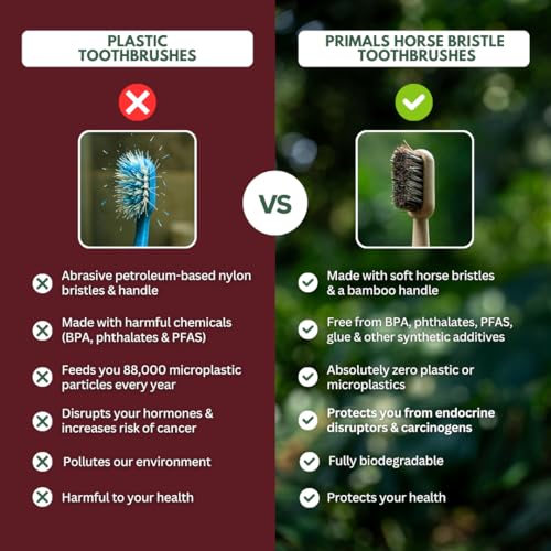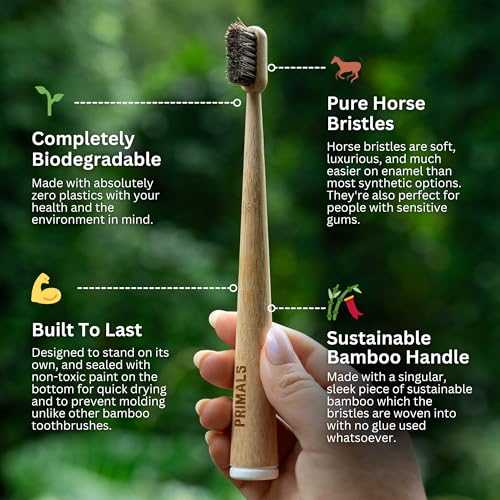 Specification: PRIMALS Horse Bristle & Bamboo Toothbrush (4-Pack) – Luxurious & Soft Horse Bristles – Fully Biodegradable – Plastic & Nylon Free – Quick Dry Design